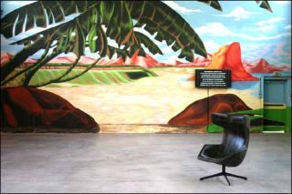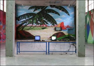 Les murs de l’alcôve du Palais de Tokyo sont recouverts par trois grandes fresques : la première se présente comme un tag, la seconde « réalise » un paysage balnéaire tropical, et la troisième tient du graphisme. Il y a peut-être là une monstration de plusieurs types de représentation ? Rien n’est moins sûr.