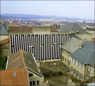 Tania Mouraud, à travers son intervention à l’extérieur du musée, prolonge son processus d’écritures dans l’espace public. Depuis plus de vingt ans, elle crée des peintures abstraites en incrustant des phrases plus graphiques que lisibles de par leur traitement typographique, aujourd’hui très reconnaissable. Si elle a commencé avec des phrases iconiques et politiques pouvant s’assimiler à des slogans, elle poursuit, aujourd’hui, avec des expressions de plus en plus intimes, sensibles, émotionnelles, poétiques, universelles, comme des phrases de résistances, souvent reprises dans ses performances. Elle s’empare ainsi de la façade latérale du musée de 40 mètres, avec la phrase «Ceuxquinepeuventserappelerlepassésontcondamnésà lerépéter» qui vient rappeler aux Hommes leur manque de remise en question face à l’Histoire. Elle fait écho à l’installation Ad Nauseam à l’intérieur du musée et donne à réfléchir sur une position citoyenne face à l’état de notre monde. Une autre œuvre sur la façade frontale reprend l’expression «Mêmepaspeur», reproduite également sur les billets d’entrée.