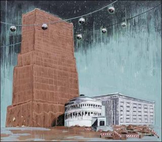 Comme souvent, passer par le biais d’histoires particulières est le meilleur moyen d’atteindre l’universel. Autre histoire particulière : celle qui inspire Ministry of Communication. Le tableau place côte à côte une tour argileuse qui évoque la tour de Babel et deux bâtiments moins monumentaux et plus modernes dont l’accès en embarrassé par des travaux. Un téléphérique aux cabines sphériques surplombe le tout, sur un fond de ciel fait de coulures de peinture bleue sur un fond noir, irréel et angoissant.