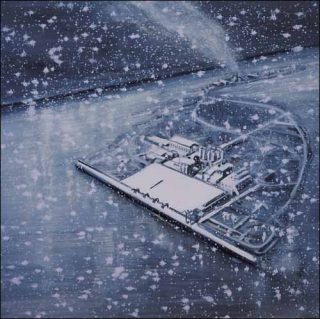 Dans Wooden Houses, qui représente un lotissement à l’architecture sérielle à la nuit tombée, la présence humaine est simplement suggérée derrière les murs des maisons. L’usine de Ionisation est, quant à elle, comme dissimulée derrière un écran de neige tombante qui agit comme un filtre — la mémoire?