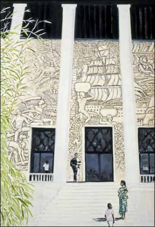 Il en est de même avec la toile intitulée Eboubié-M.A.O. L’espace d’une seconde, le petit garçon tiré par le bras de sa mère est arrêté, fasciné par la fresque monumentale qui se déroule sous ses yeux, contant l’histoire de toute une civilisation.