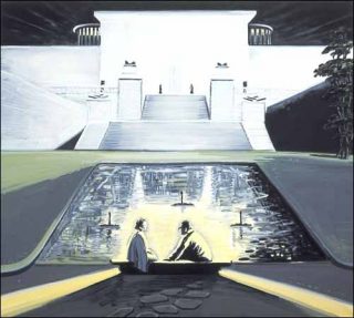 Les cadres que l’artiste choisit procède pour beaucoup de la photographie ou du cinéma : ce couple au premier plan d’une architecture moderniste, au crépuscule, semble tout droit sorti d’un film romantique ou d’une carte postale bon marché ; de même, cet autre couple décalé sur la gauche de la composition, se déchirant, un verre à la main, rappelle une fiction dramatique. Fort de ce cadre déjà vu, l’artiste peut ainsi se concentrer sur ce qui l’intéresse véritablement, c’est-à -dire la représentation de l’instant précis qu’il représente. Un instant unique, pendant lequel culmine l’intensité du sentiment, l’expression d’une émotion pure. Très difficilement traduisible et reproductible, ce moment tient à très peu de choses. C’est pourquoi, la peinture, la matière du peintre se fait discrète, limitée et le temps est comme suspendu.