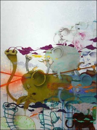 Adeline Jeudy. Je suis là pour convaincre les sceptiques. Notre couleur est très Pop et cela jure un peu avec la culture française. Plus généralement c’est le figuratif qui est décrié. Mes artistes sont dans l’exagération. Les toiles sont extra-figuratives, ce sont des cartoons. Mais ce sont plus que des images marrantes. Elles expriment l’état d’esprit d’une génération. Je ne comprends pas pourquoi il n’y a que Perrotin qui peut montrer des artistes comme Murakami ou Mr. Je suis là pour diffuser cette bonne parole.
