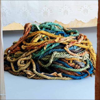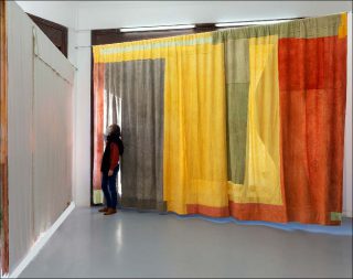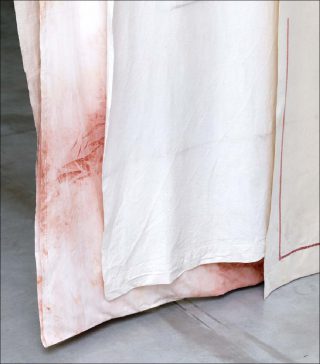 On retrouve sous la teinture des étoffes anciennes, parfois brodées, souvent réutilisées, qui portent dans leur matière la mémoire de vies antérieures. Le teinturier est alors le magicien, alchimiste des couleurs, qui les revivifie et les transforme. Il fait d’une matière ancienne le drap, lange et suaire, d’un nouveau paysage offert aux spectateurs.