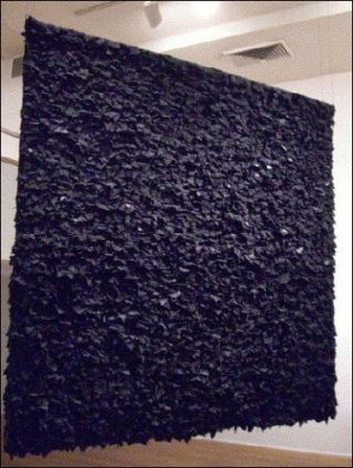 Enfin, achevant de témoigner de la diversité de ces travaux, Joël Andrianomearisoa, malgache, travaillant lui aussi le textile, occupe l’espace par un long assemblage de tissus, tous noirs. Le noir est la couleur fétiche de l’artiste, pour toutes les variations qu’elle peut offrir, dans ses jeux avec la lumière et la matière. Joël Andrianomearisoa parle lui-même d’un hommage à la peinture de Pierre Soulages.