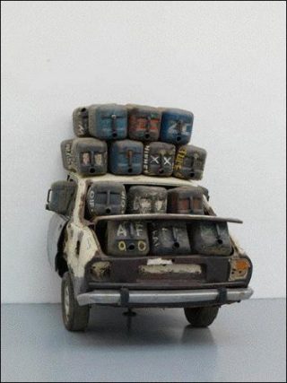 Elf, rien à foutre est une installation du béninois Romuald Hazoumé. On y retrouve les bidons d’essence qui forment une grande partie de son vocabulaire plastique. Mais ici, ils ne sont pas transformés en masques: ils constituent la marchandise d’une moitié de voiture, qui vient buter contre le mur de la galerie. Romuald Hazoumé évoque souvent dans son travail l’omniprésence du trafic d’essence au Bénin et dénonce la répression par les autorités de ce circuit parallèle qui tente d’échapper aux grands groupes pétroliers.