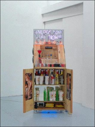 — Cameron Platter, Unlock Your Life Now (ATM/ Minibar/ Gospel Soundsysytem), 2008. Carved wood, mixed media, found objects. 210 x 60 x 80 cm