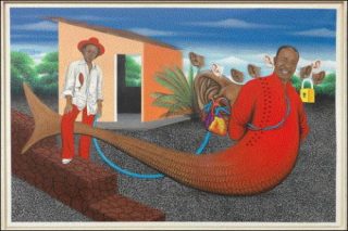 — Chéri Samba, Le Secret d’un petit poisson devenu grand, 2007. Acrylique et paillettes sur toile. 135 x 200 cm