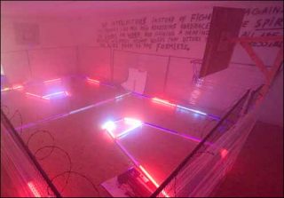 Autour, car l’installation se révèle impénétrable: grilles, grillage, barbelés empêchent tout accès à cet espace dans l’espace.