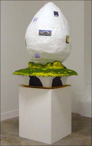 Au fond de la galerie, une sculpture suscite la curiosité, tant sa forme est loin d’être évidente. Il s’agit en fait d’un chapeau géant, dans la veine de ceux que fabriquent les carnavaleux du Nord de la France, de Belgique ou de Suisse. Balthazar Lovay a puisé dans le folklore de son pays natal, plus exactement dans celui des appenzellois, ces habitants suisses du canton d’Appenzell Rhodes-Extérieures qui ont pour coutume de se parer de coiffes et de masques spectaculaires lors de la nuit de la Saint-Sylvestre.