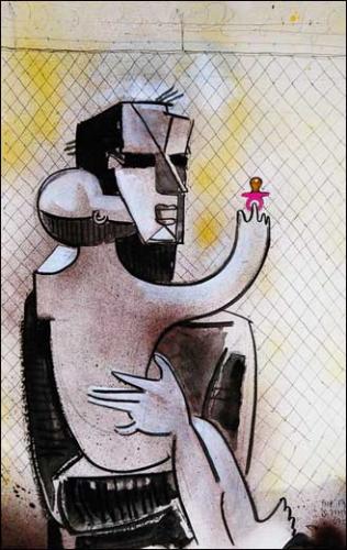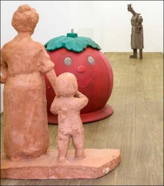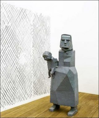 A l’ère des politiques de rigueur, l’artiste convoque la figure ancestrale de la mère à l’enfant comme première cellule identitaire familiale, culturelle, sociétale, ici et maintenant allégorie d’un modèle social de solidarité précarisé. Associés aux sculptures échelle 1 de plâtre et de résine, le wall painting, grille graphique structurante et grillage contraignant, les dessins exploratoires ou l’installation souterraine dédiée au lieu sont autant d’éléments de syntaxe du langage de l’artiste.