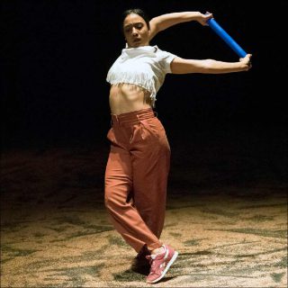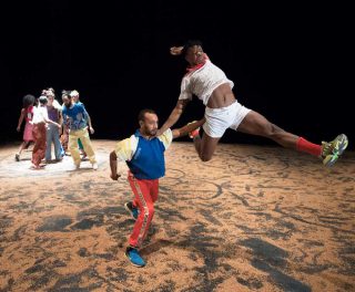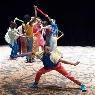 Sur la scène recouverte de sable, douze jeunes femmes et hommes dansent en tenues décontractées et colorées en formant un groupe d’apparence bigarrée, à l’image de leurs nationalités différentes. Ils sont munis de bâtons, également de toutes les couleurs, qu’ils brandissent individuellement puis qu’ils relient pour créer des figures collectives.