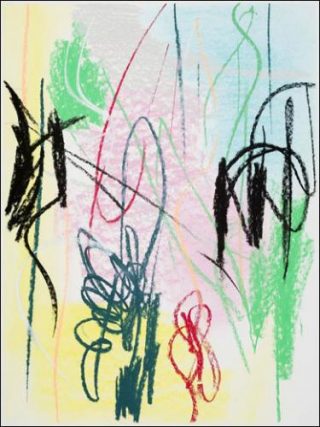 Dans ses pastels, Alain Séchas semble s’interroger sur la question de l’espace et de son possible remplissage. Ce à quoi il répond par des gestes nerveux, rapides et frénétiques, qui compulsent à la surface des toiles. Les traits sont vifs et exécutés sur des fonds de couleurs dégradés. Soit ils s’incarnent dans des sortes de serpentins, soit ils se structurent davantage dans des bandes horizontales et verticales, qui s’entrecoupent et partent parfois en hors-champ.