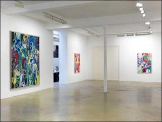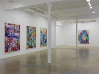 La première salle de la galerie réunit des toiles homogènes, aux couleurs pastel avec des dominantes de jaune acide. Un seul tableau présente une harmonie sensiblement différente: sur un fond bleu, des traits vert foncé et vert anis semblent tracer des entrelacs.