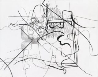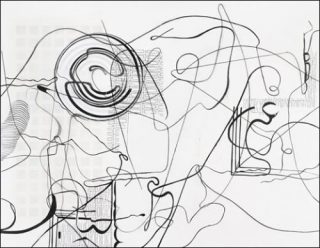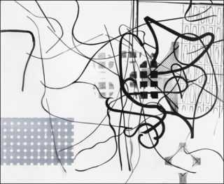 Les cinq peintures de très grand format et la série de dix dessins, présentés ici sous le titre de Conduction, sont dans la droite ligne de cette recherche formelle. L’artiste interprète à nouveau les motifs façonnés dans ses peintures par ordinateur. Il explore la collusion des lignes et des objets dans un espace indécis et flottant, mixant des formes qui ont la régularité du dessin technologique avec des traits impulsifs proches de la rature ou de l’écriture automatique. Tout est traité sur le même plan, il n’y a aucun ordre ni hiérarchie dans l’assemblage, sinon une nécessité d’équilibre de ces grandes compositions articulées.