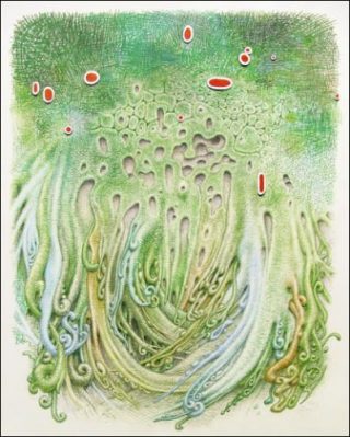 Les formes deviennent étranges et les couleurs excentriques. Une forme de virtualité contemporaine se fait ressentir à travers une impression globale plutôt perturbante.