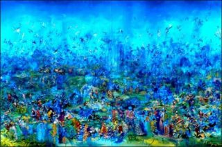 La première couche à peine esquissée avec des silhouettes de personnages vaquant à leurs affaires, participant à des orgies, habillés la plupart du temps en costumes bariolés, guerroyant ou festoyant comme dans certaines scènes bucoliques de Watteau, ce sont les points de détail, les accidents et incidents de parcours qui saisissent le spectateur. Cette recherche d’exhaustivité sous forme d’accumulation exprime certainement l’horreur du vide.