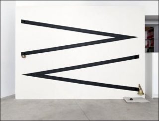 — Paul Kos, Diminuendo / Crescendo, 2011. Adhésif, boule en acier, bois, tuyau en pvc, cloche en bronze, oreiller. Dimensions variables