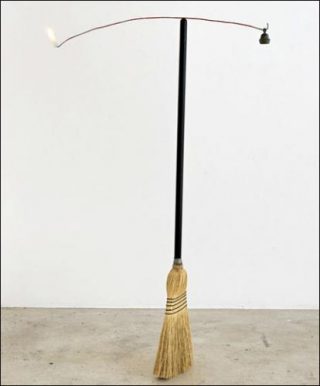 — Paul Kos, Equilibre IV, 1992. Balai, cintre, bougie et clochette. 145 x 102 cm