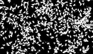 — Mouches, 2002. Photogramme. 100 x 300 cm. Kan Xuan, Les Œufs, 1999. Vidéo. 4 min 20 s.