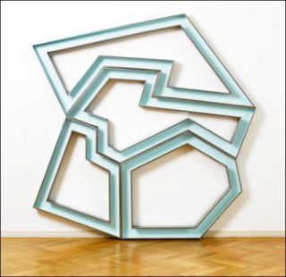 A la Galerie Thaddaeus Ropac, les sculptures en céramique sont confrontées à trois œuvres en acier de la série Alphabet, revêtues de laque de couleur vive. La limpidité et la sobriété graphique des œuvres en acier contrastent avec les plis et volutes des sculptures en céramique. Elles se composent de pentagones, hexagones ou heptagones emboîtés au sein de structures en nid d’abeilles ou en toile d’araignée. A mi-chemin entre le relief mural et la ronde-bosse, elles s’appuient contre le mur et touchent le sol.