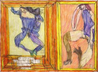 Aujourd’hui âgé de 66 ans, Josef Hofer est toujours décrit comme un grand enfant qui aime à jouer. Si certains de ses dessins pourraient y faire penser — on pense aux dessins exposés sur le mur de droite en entrant et qui figurent un homme ou des objets flottant sur la page blanche — ceux dont on vient de parler et qui reposent sur ce principe de cadre proliférant jusqu’au bords de la feuille relèvent d’un regard dénué de toute naïveté. On perçoit ici une tension dramatique qui renvoie à une interrogation sur notre condition d’être.