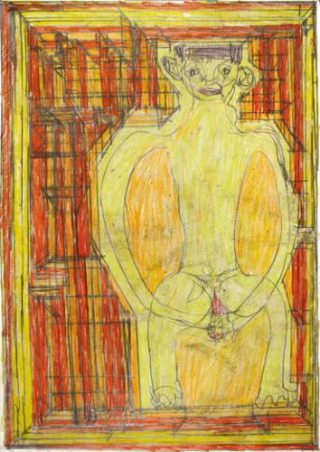Et ce cadre, ce motif qu’il répète inlassablement autour de ces figures, serait finalement comme une forme de socle et de cadre qui vient montrer la figure, la présenter à notre vue. En même temps qu’un moyen pour l’artiste de se l’approprier, la faire rentrer dans son monde. C’est un cadre rassurant dans lequel il emprisonne — ou protège — ces êtres sortis de son imaginaire, de sa main et de son cerveau.