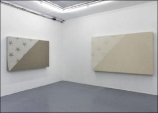 Dans ses dernières réalisations, celles qu’il montre chez Almine Rech, il fait réaliser les mêmes performances sur des panneaux cette fois-ci recouverts d’une représentation laconique de paysages typiquement californiens: soleils de crépuscule coupé par la sihouette longiligne des palmiers.