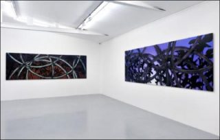 On observe, sur de grands panneaux métalliques, les entrelacs de gommes colorées laissés par le passage des pneus d’une moto lors de performances artistiques sauvages. Les courbes dessinent des lianes difficiles à déchiffrer, seuls ressortent une espèce d’énergie vibrante, un geste iconoclaste dont le résultat surprend par sa finesse et l’improbable conciliation des couleurs.