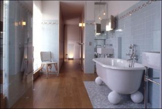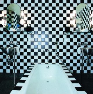 — Salle de bains de l’hôtel Morgans, 1984. Damier de grès cérame de 10 × 10 cm, vasques en métal.