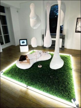 L’utopie d’arrêter le temps est un des motifs principaux d’Amorphe. Malgré l’illusion d’immobilité, il y persiste des symptômes discrets d’écoulement du temps. On y voit une forme, à moitié vivante, à moitié morte, sans conscience, indifférente à son entourage et solitaire. C’est le personnage «amorphe» gisant à l’intérieur de l’installation.