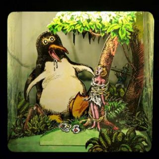 Avec les planches originales, sont présentées des boites en verre en forme d’aquariums. Ces boîtes constituent des petites saynètes, sortes de petits théâtres vivants où sont mis en scène des personnages en carton —de Kink -Kong à Monsieur Ferraille. Subversives, elles contribuent à réécrire les mythes de la bande dessinée qui se révèle ainsi être comme un théâtre du monde où les personnages les plus grotesques débordent de la fiction pour mieux dénoncer les tares du monde.