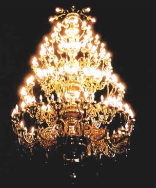 Souvent photographiés dans l’obscurité, les plafonniers apparaissent sur un fond sombre indéterminé qui en fait resurgir les caractéristiques sculpturales. Dorures, agencement complexe des ampoules en couronne ou en pyramide, tous ces détails témoignent d’un attachement populaire au caractère symbolique de la lumière, dans ce qu’elle a de magique et de sacré.