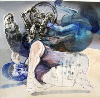 L’espace ramassé de l’œuvre, collage dessiné d’un réel imaginaire, perturbe l’acquis de nos certitudes, l’ancrage ordinaire de nos repères spatio-temporels. La construction du tableau -montage insolite de fragments de corps déstabilisés, de femmes culbutées, d’anges sur roulettes, de chaises électriques débranchées, d’anatomies incertaines, d’extase et de violence, de chaos et de rigueur, de mouvement et de dédoublement– accentue la fragilité d’espaces ambigus et révèle les anagrammes plastiques univers onirique décomposé/ recomposé.
