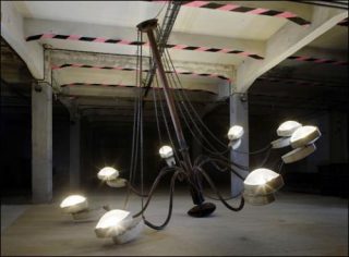 Annonciateur de jours sombres, ce diable est proche de I see I see I see (2009), oiseau de mauvais augure post-punk devisant à propos de la crise et nous prédisant de sinistres demains. A l’origine en tchèque, la bande son de cette œuvre a été réalisée en français spécialement pour cette exposition à la Station. Mais d’autres œuvres, plus joyeuses, nous ramènent le sourire aux lèvres: des chaussures de ski tentent de s’échapper (Romeo und Julie aus Dachstein, 2011), des formes roses et féminines s’affalent sur une chaise de bureau (Lida, 2011), tandis que des balles de gymnastiques dégoulinent de polyuréthane (He — Well hidden, 2011).