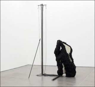 — Nick van Woert, Surveyor, 2011. Résidus de charbon, statue en fibre de verre, acier, corde, uréthane. 238,8 x 81,3 x 78,7 cm (pour la pièce en acier), 121,9 x 68,6 x 50,8 cm (pour la statue).