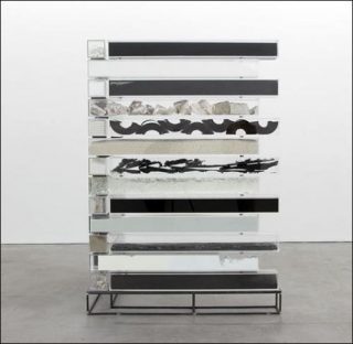 Not Yet Titled 2 (B&W boxes) explore d’ailleurs la densité des matières, et les parois de plexiglas de l’œuvre laissent apparaître tantôt du Coca-Cola comme congelé, des produits gélatineux et fondus, tandis que plus haut le sel de table revêt l’apparence d’un sable fin inatteignable. La superposition des différentes matières explore le principe de sédimentation, et les déchets deviennent de vraisemblables couches géologiques.