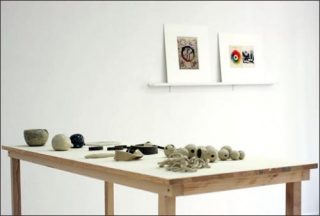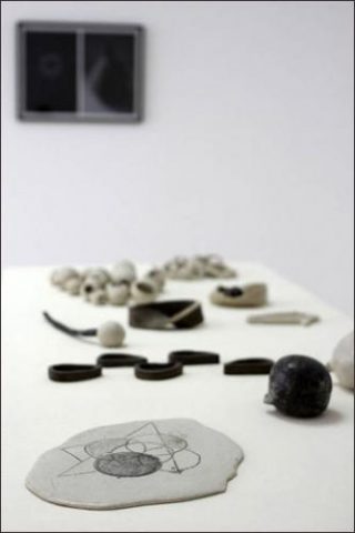 Dans les petits objets en céramique que Laëtitia Benat façonne, c’est d’abord la couleur blême de la terre non émaillée qui saute aux yeux. Chacun des artefacts se caractérise par une forme abstraite: certaines sont élémentaires (comme le ruban de Moebius), d’autres renvoient à des époques primordiales (comme le bol). Toutes sont évidées, comme pour suggérer un manque ou une perte. Présentés dans un dispositif qui rappelle les vitrines des musées d’histoire naturelle et d’archéologie, ces objets renvoient à un temps lointain, quasi-préhistorique. N’ayant pas le même degré de finition, leurs différents aspects renvoient à des stades de conservation et des strates temporelles successifs.