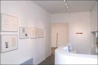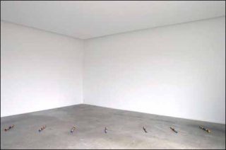 Neuf barres rondes sont exposées à la galerie Art : Concept. Dans une salle blanche, un bâton, seul, isolé, d’environ 1,80 mètre de long, est appuyé verticalement contre un mur. Dans l’autre, une série de huit bâtons de 40 centimètres est alignée horizontalement, à un mètre d’intervalle, sur le sol gris.
