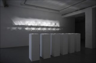 L’appareil, dupliqué en six exemplaires et rangé dans des caissons dont les faces intérieures ont été recouvertes de miroirs, ne projette rien sinon le reflet répété de la lumière censée éclairer la bande. Une bande ici absente mais vite remplacée par le bruit du moteur de l’appareil, ce son lancinant reconnaissable entre tous du moment de la projection.
