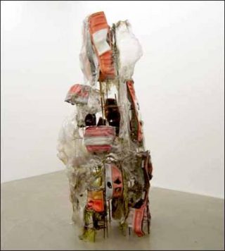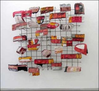 Les grilles industrielles deviennent les supports où se greffent des assemblages aux allures semi-organiques dont, semble-t-il, pourraient surgir des êtres nés de l’imagination de Cronenberg. Pourtant, Xavier Douroux et Frank Gautherot insistent sur le caractère identifiable de chacun des objets utilisés par l’artiste: «Ligaturés, emmaillotés, entravés, ils sont comme recroquevillés, comme déliés, sans pour autant que leur existence ne devienne une énigme». Au fond, confettis et fourrures salies peaufinent l’art grunge de la dépouille barbare.