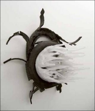 La forme se désagrège jusqu’aux limites de l’informe. Mais la violence qui s’imprime dans les transformations de la matière émane directement du procédé de création, à savoir la combustion du plastique, fortement toxique et polluante. La critique du système passe alors par le réinvestissement de ses propres dérives.