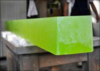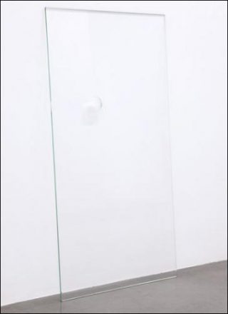 À la densité de la poutre répond la transparence de deux volumes de verre disposés eux aussi sur le sol. Teintés dans la masse, ces parallélépipèdes, ont été créé en Tchéquie. Ils captent une lumière qui donne la sensation d’irradier depuis l’intérieur des œuvres.