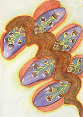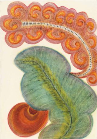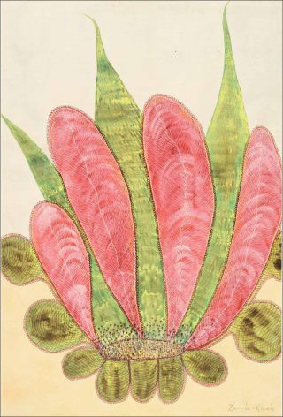 Comment tant de vie, tant de couleur, peut naître de la rumination de si sombres évènements ? C’est le mystère de l’art, de la sublimation du réel, qu’Anna Zemà nkovà fait éclore dans ses mystérieux végétaux au stylo bille et pastel. On s’y promène entre des tiges élancées comme des flammes, pourvues de graines qui sont peut-être aussi des tentacules, on y trouve la douceur des feuilles en volutes, aux couleurs tendres, et des motifs aquatiques, aussi finement tissés que les ridules sur la surface de l’eau, où flottent de délicats nénuphars.