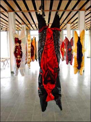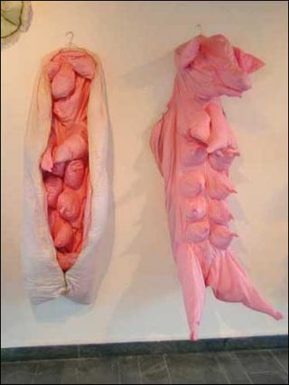 J’ai réalisé les Putching balls avec l’idée de les faire ressembler à des silhouettes humaines et animales et de jouer avec l’ambiguïté des rapports homme/animal. Pendant l’exposition une des pièces a été éclatée par un visiteur. J’ai été choquée par ce vandalisme que j’avais provoqué puisqu’on ne réalise pas des sacs de frappe sans courir ce risque. J’ai ensuite terminé la pièce qui ressemblait à une banane épluchée et qui est devenue par la couture une fleur.