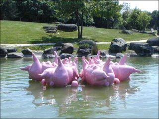 La sculpture suivante a été réalisée à partir d’un patron, comme pour mes pièces en tissu, mais avec un matériau rigide, qui flotte. Elle est installée au domaine de Chamarande. Pour ces pièces plus rigides, ce sont les matériaux qui m’intéressent, comme pour ces cochons en résine, installés sur l’eau. J’ai intitulé cette pièce Esther Williams, en hommage à la natation synchronisée que j’ai adoré pratiquer.