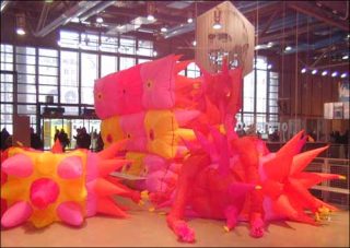 En mars 2006, j’ai réalisé une pièce pour l’atelier des enfants au Centre Pompidou. J’ai invité les enfants à utiliser les modules gonflables de mes pièces pour fabriquer leurs propres jeux de construction avec des machines pour laver les voitures afin de purifier les gens qui entraient. Actuellement, je travaille à recycler une mine de vêtements en les enroulant comme des sortes de Kebab autour d’un axe.