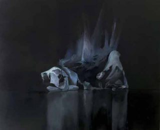 Dans la première salle, consacrée aux huiles sur bois aux titres oniriques (Rocher, Cascade, Nocturne), Anne-Laure Sacriste peint de l’eau, une eau sombre et opaque sur laquelle flottent des îles fantomatiques. Ce thème a priori bucolique donne lieu à des visions ténébreuses. Les couleurs très diluées se détachent à peine des fonds sombres, presque noirs, des tableaux. Tandis que le bois absorbe tous les éclats de l’huile.