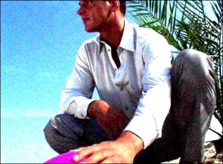 Le premier homme qui apparaît à l’écran est brun. Assis, il porte une chemise blanche et un pantalon gris qui cachent — ou protègent — un corps d’athlète. Son attention se porte sur une balle de caoutchouc rose posée sur le sable. Il la prend négligemment, la malaxe, la caresse avant de la porter à sa bouche et de l’éjecter au loin.