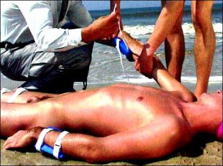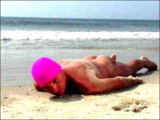 Dans la séquence suivante, cet homme est assis à côté d’un autre homme, le torse nu, apparemment plus jeune. À quelques dizaines mètres, près du rivage, un troisième homme coiffé d’un bonnet de bain de caoutchouc rose est couché sur le dos. Il est bronzé et nu, immobile, quasiment inerte. Seul l’état à demi érectile de son sexe manifeste un semblant de vie.